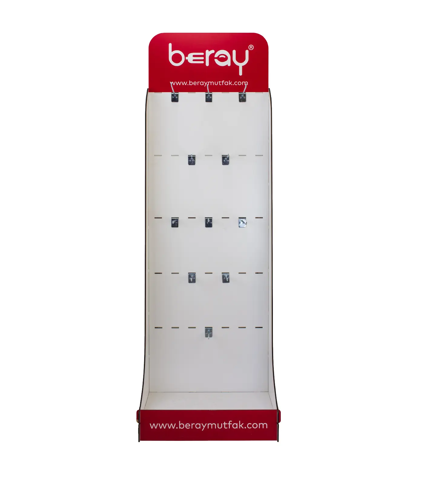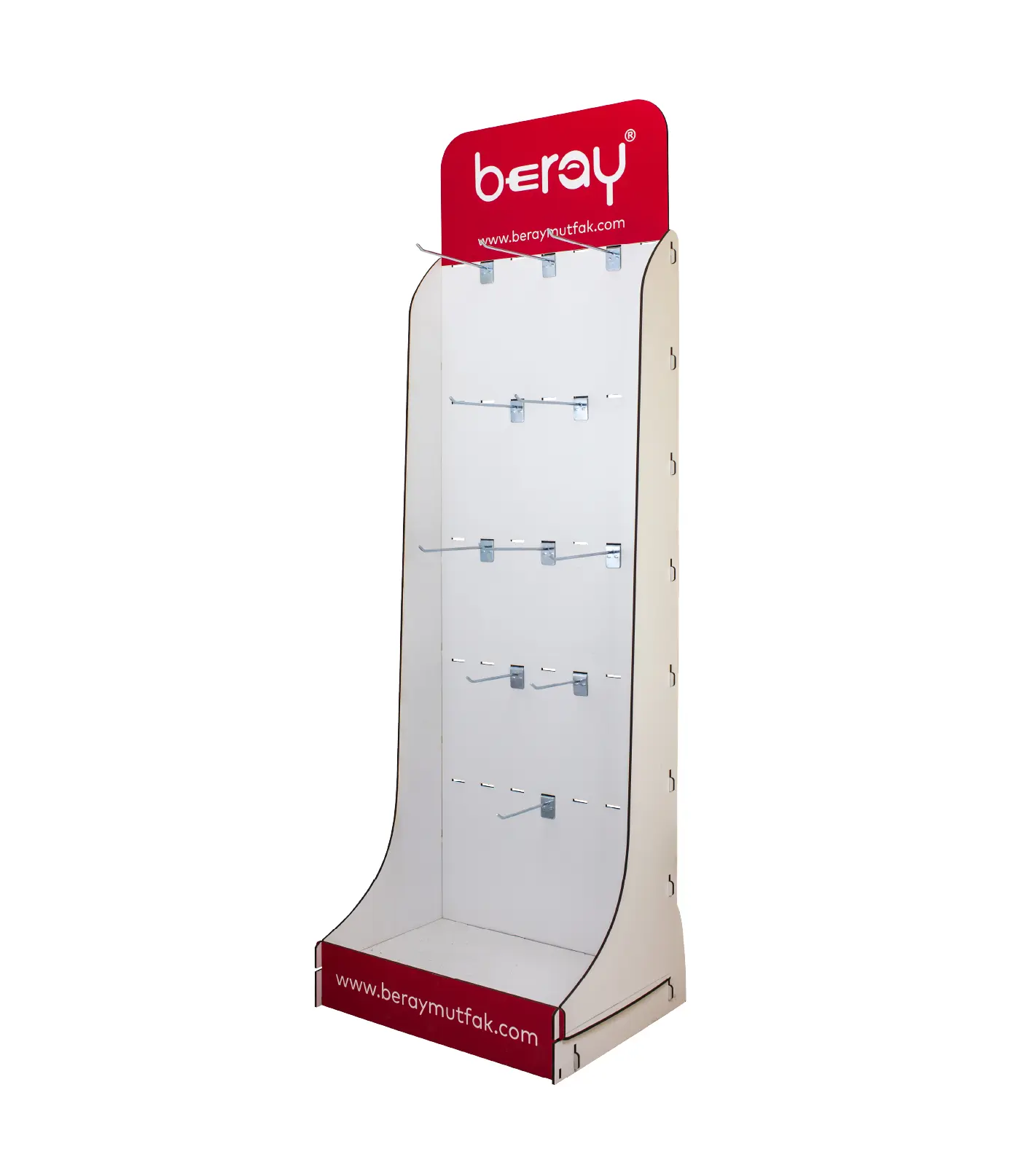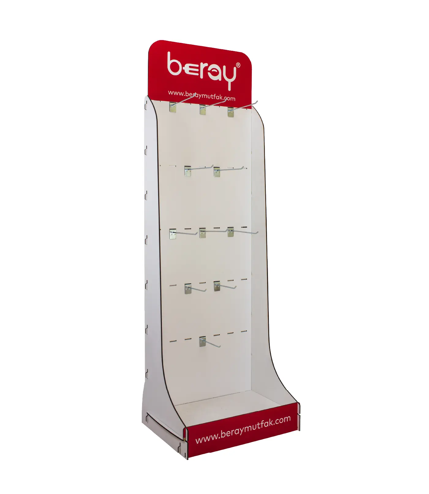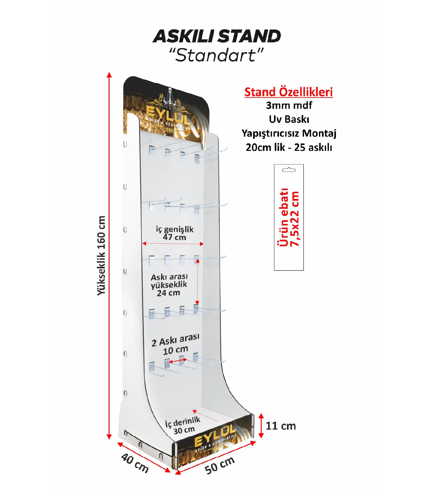 - 5mm kalınlığında dayanıklı malzemeden üretilen ahşap askılı teşhir standı. Ürünlerinizi güvenle sergilemeniz için ekstra sağlam gövde ve şık tasarım. Markanıza özel baskı imkanıyla!
