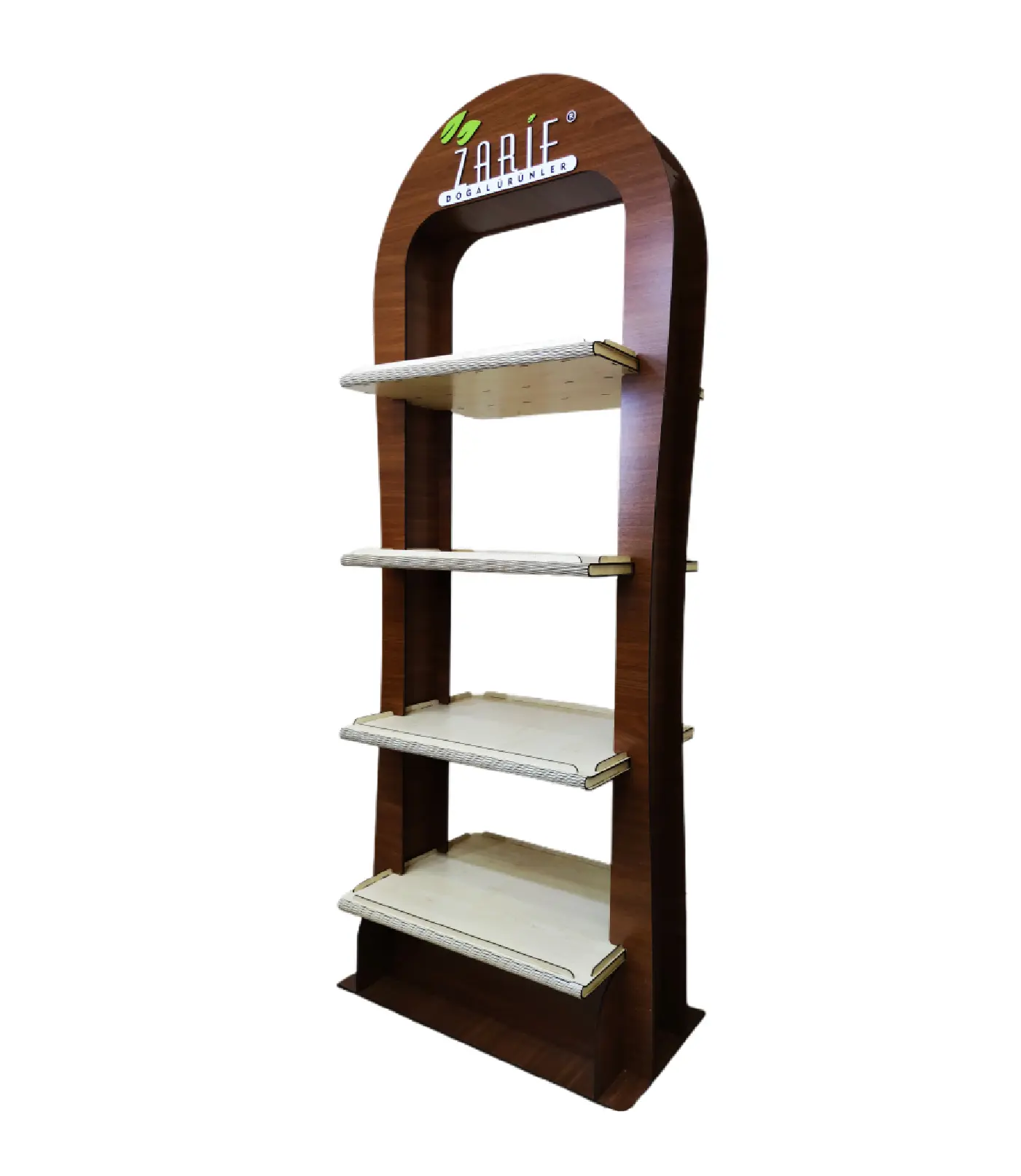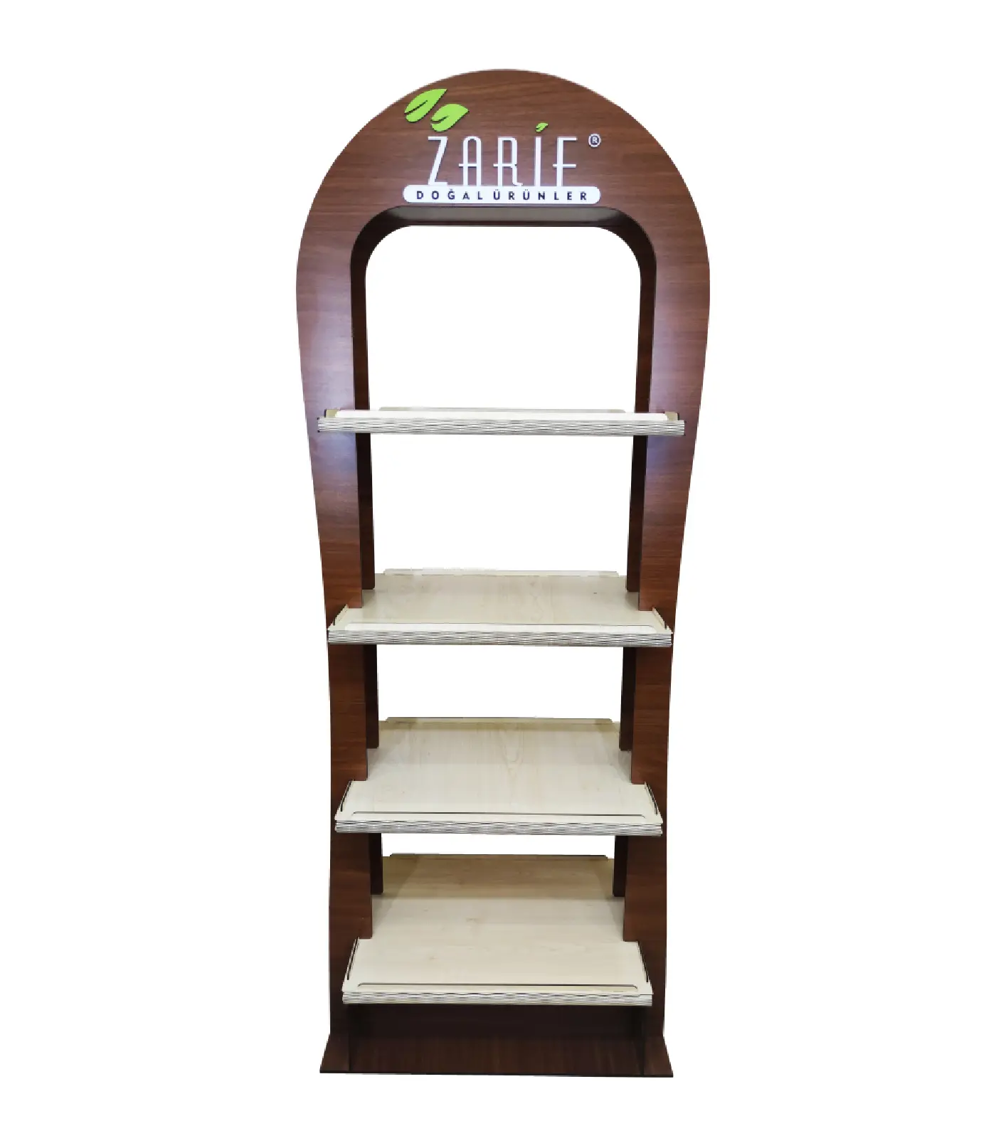Alan tasarrufu sağlayan ahşap iki yönlü raflı stand. Çift taraflı raf düzeni ve markanıza özel logo baskı seçeneğiyle ürünlerinizi profesyonelce sergileyin.